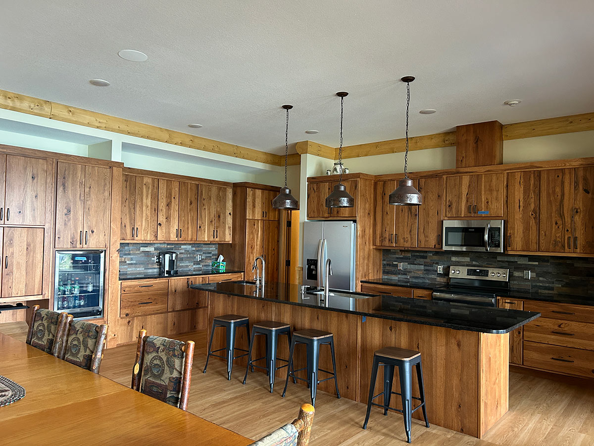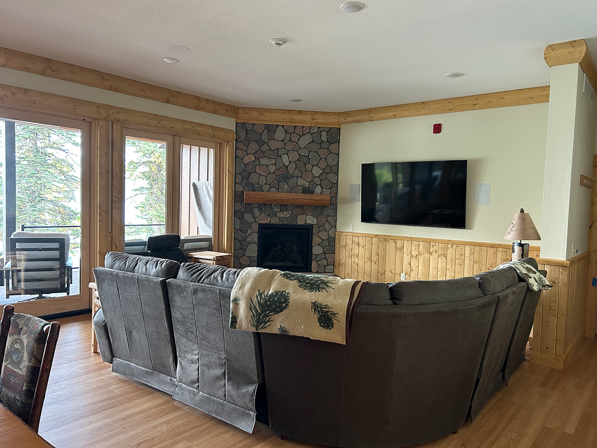 The Canopy offers an open kitchen, dining area, and cozy living room with natural wood accents — perfect for cooking together, relaxing after a lake day, or hosting multi-family gatherings.
