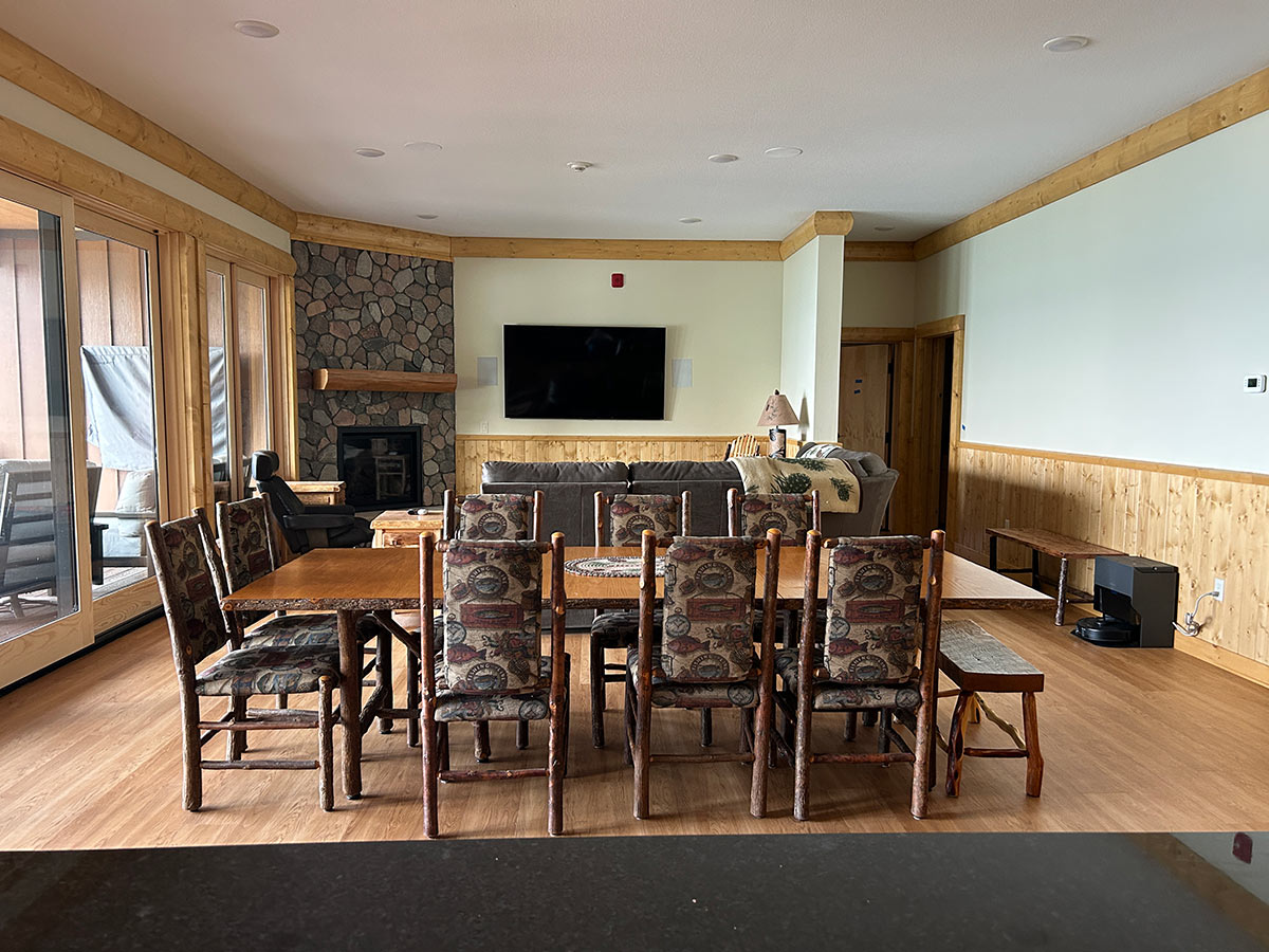 Together, The Canopy and The Grove sleep up to 20 guests, making them one of the best Minnesota lakefront group rentals for reunions, retreats, holidays, and multi-generation family trips to the peaceful beauty of Big Sand Lake — a place where memories are made and shared year after year. See more specifics about The Canopy kitchen, dining and living room